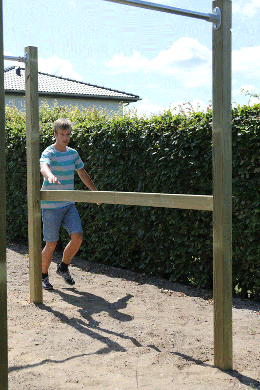 Så fik vi lavet / konstrueret et parkour stativ i haven.